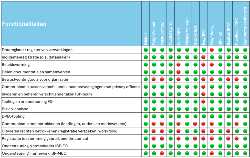 Om scholen te helpen de IBP-documentatie inzichtelijk en actueel te houden, kan gebruik worden gemaakt van software (clouddiensten) van leveranciers. Deze leveranciers helpen je om op een overzichtelijke manier aan de verantwoordingsplicht te voldoen. Dit zijn de zogenaamde Governance, Risk en Compliance tools, ofwel GRC-tooling.